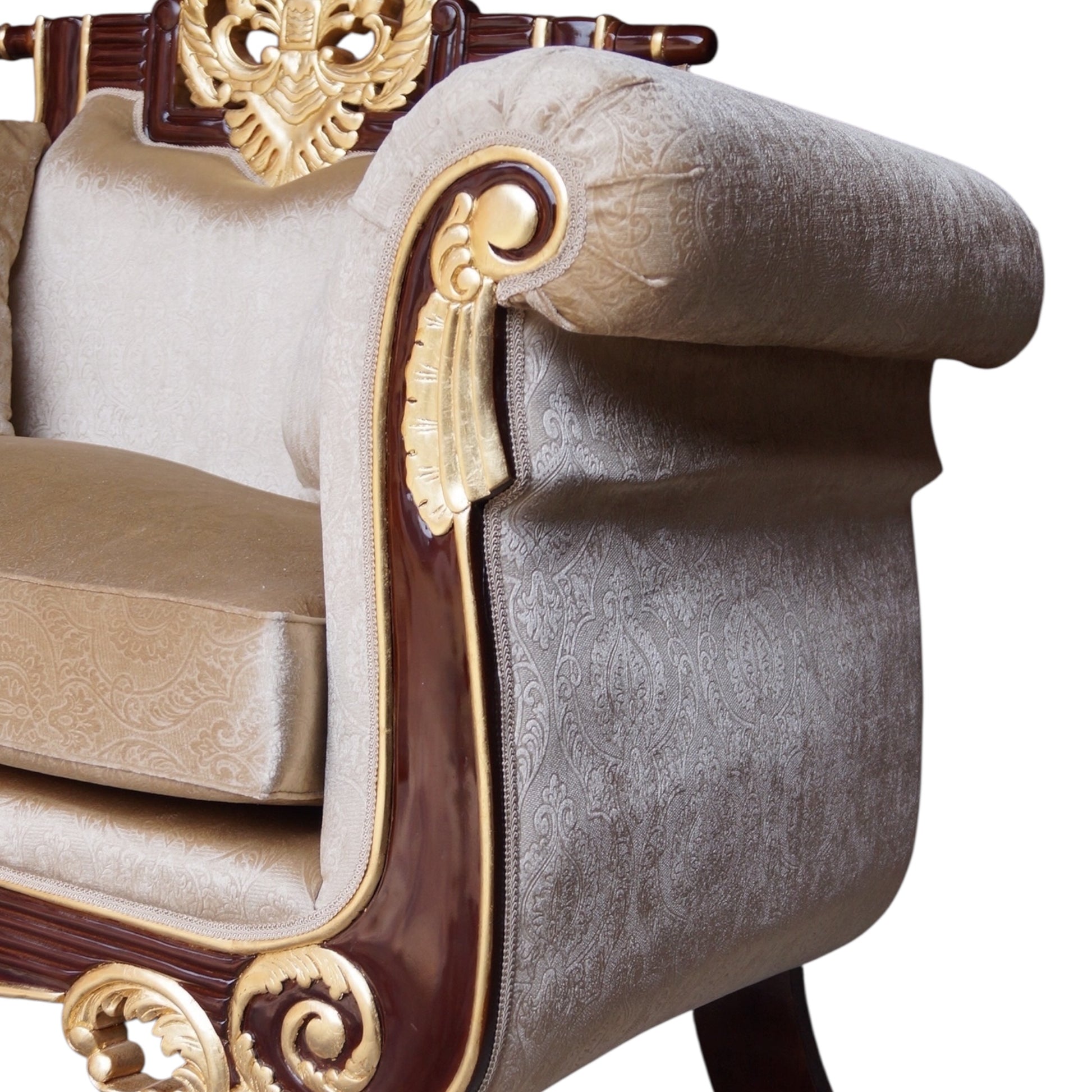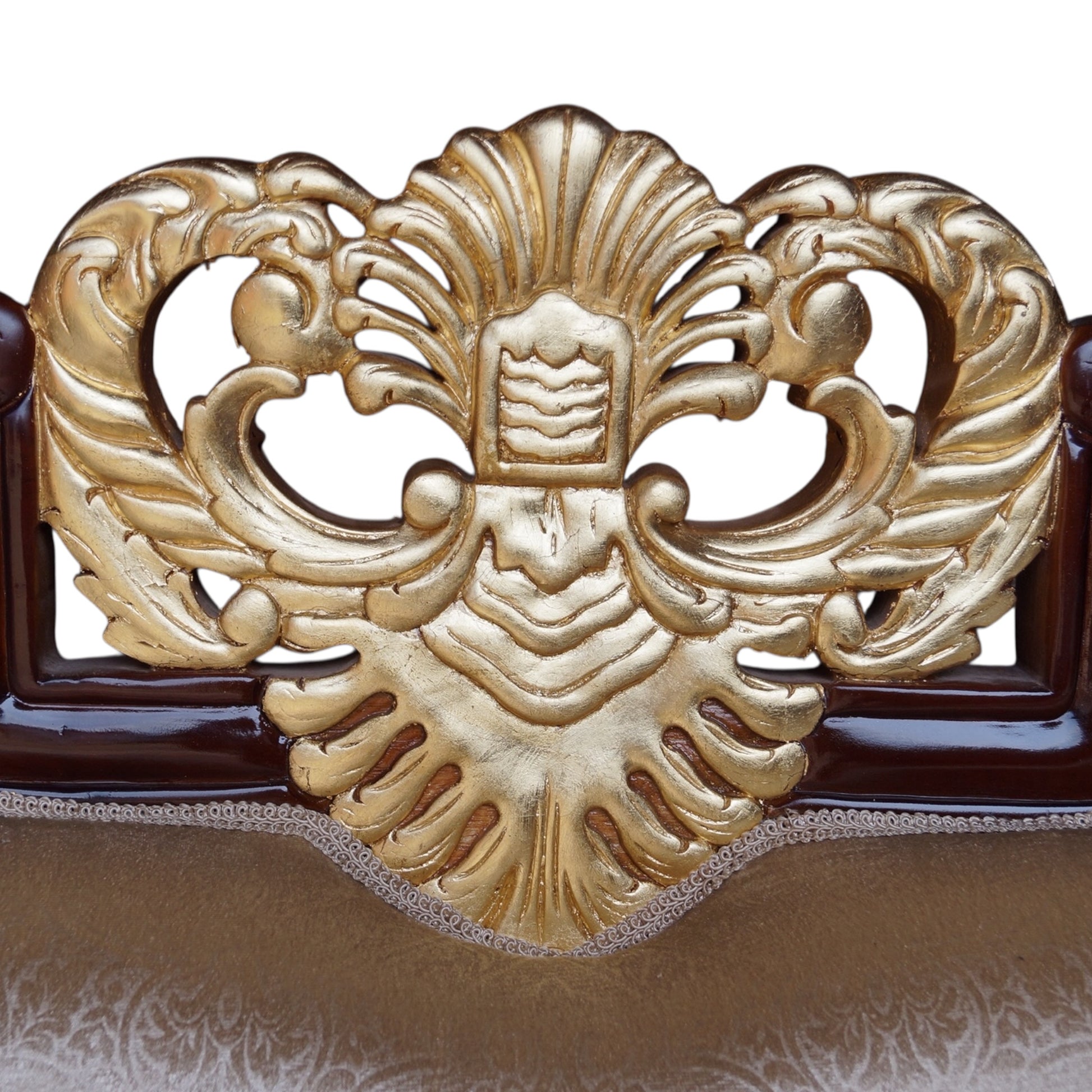 Das Medici-Sofa vereint die Wärme von dunklem Mahagoniholz mit der repräsentativen Eleganz des Gold-Finishs. Das Gestell mit den reichen, handgeschnitzten Ornamenten ist ein Zeugnis höchster Handwerkskunst. Die Kombination aus dem satten Mahagoni-Farbton, dem glänzenden Blattgold und dem luxuriösen, beigefarbenen Stoff schafft eine Atmosphäre von zeitloser Opulenz und Gemütlichkeit. Ideal als kompakter Zweisitzer im Salon, Boudoir oder als stilvoller Eyecatcher.