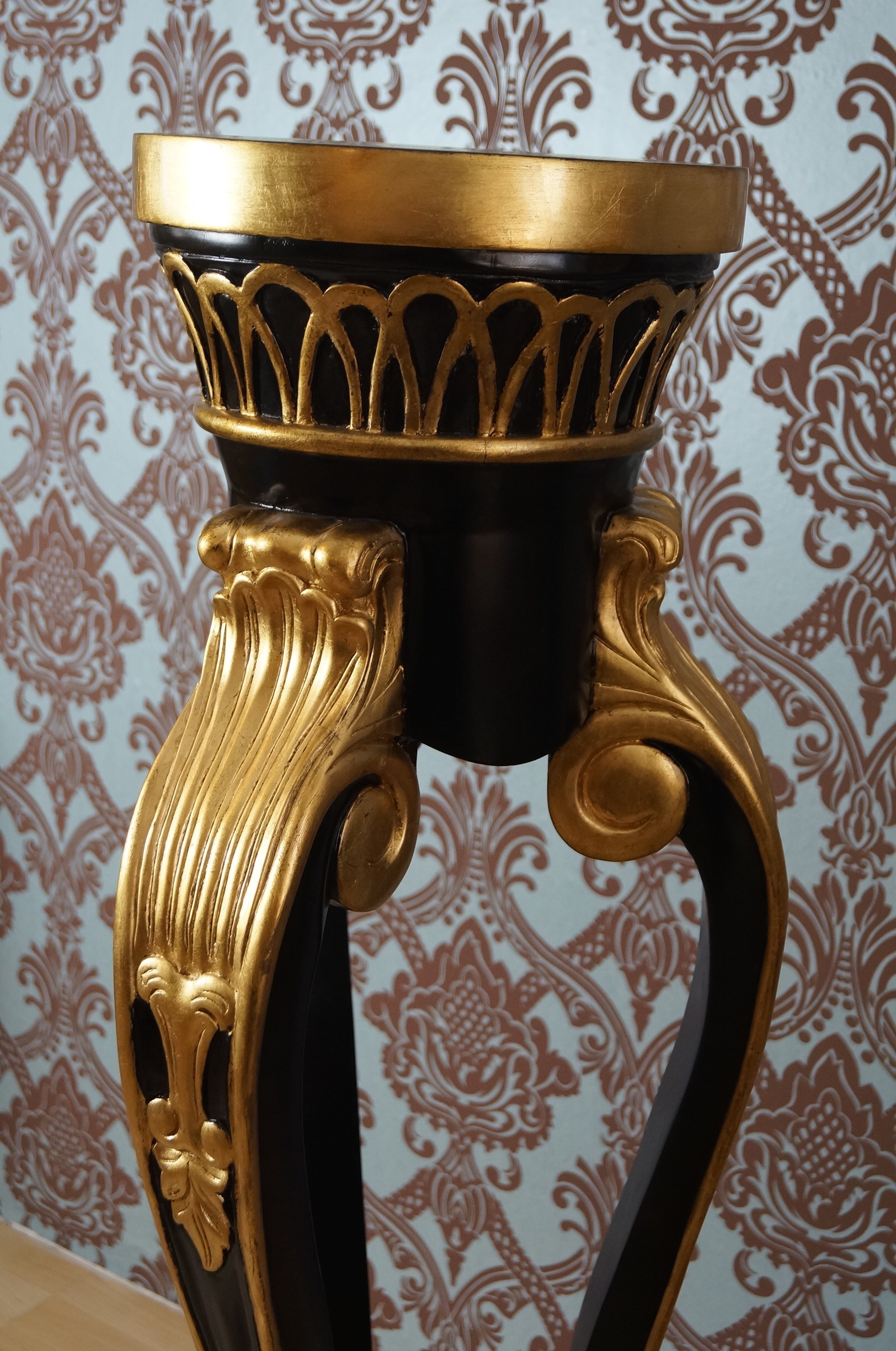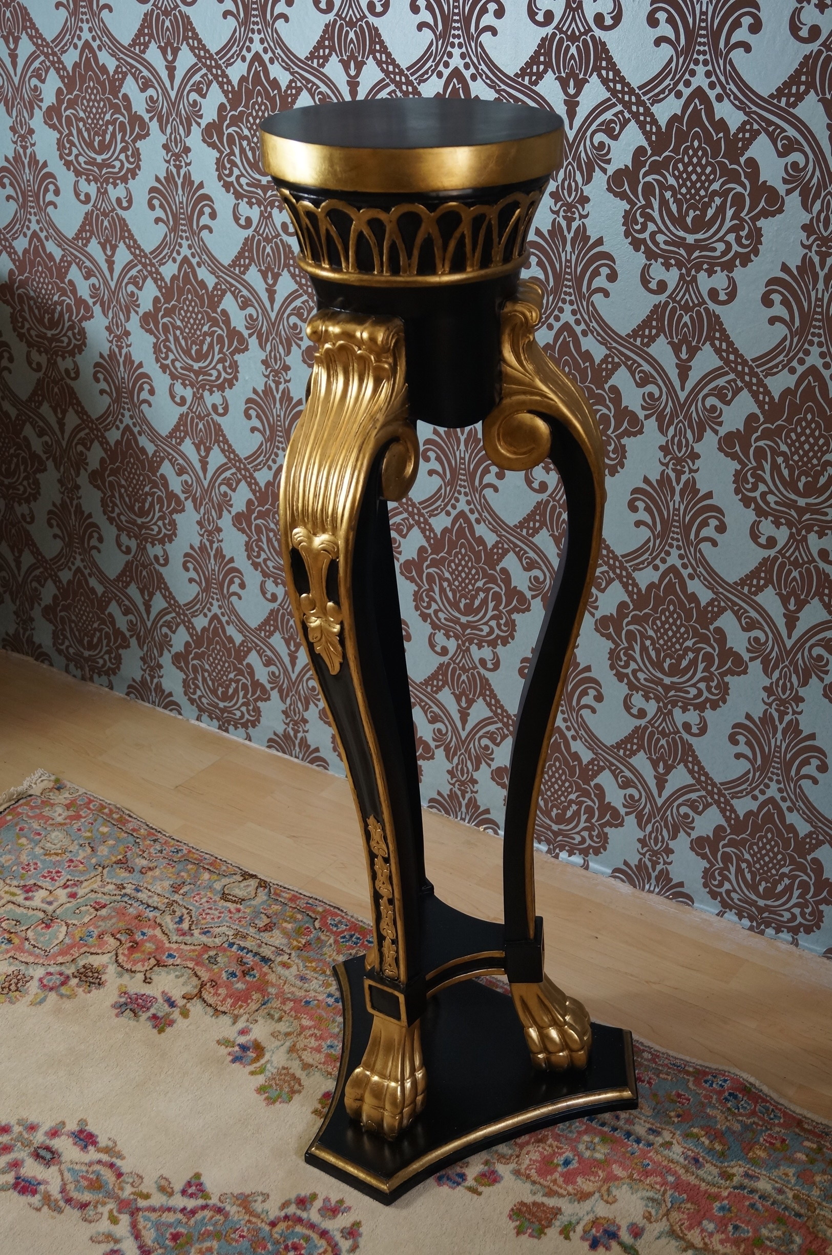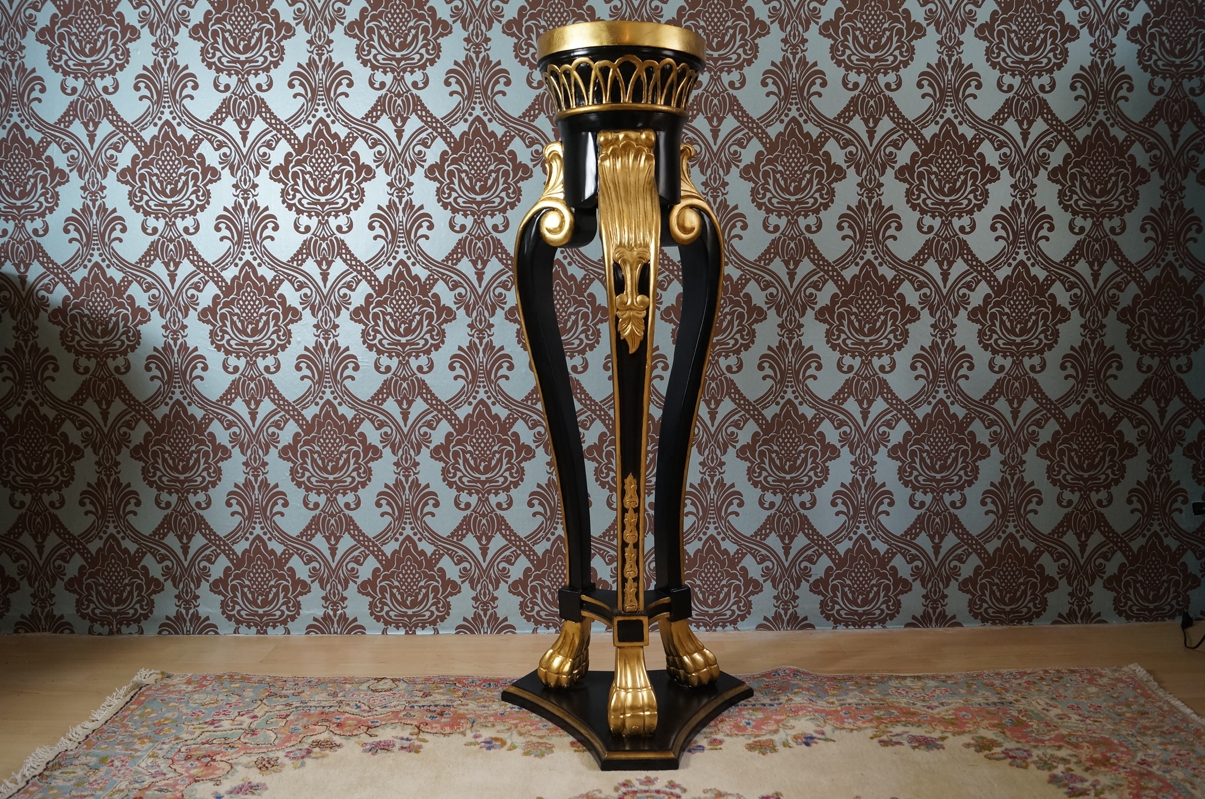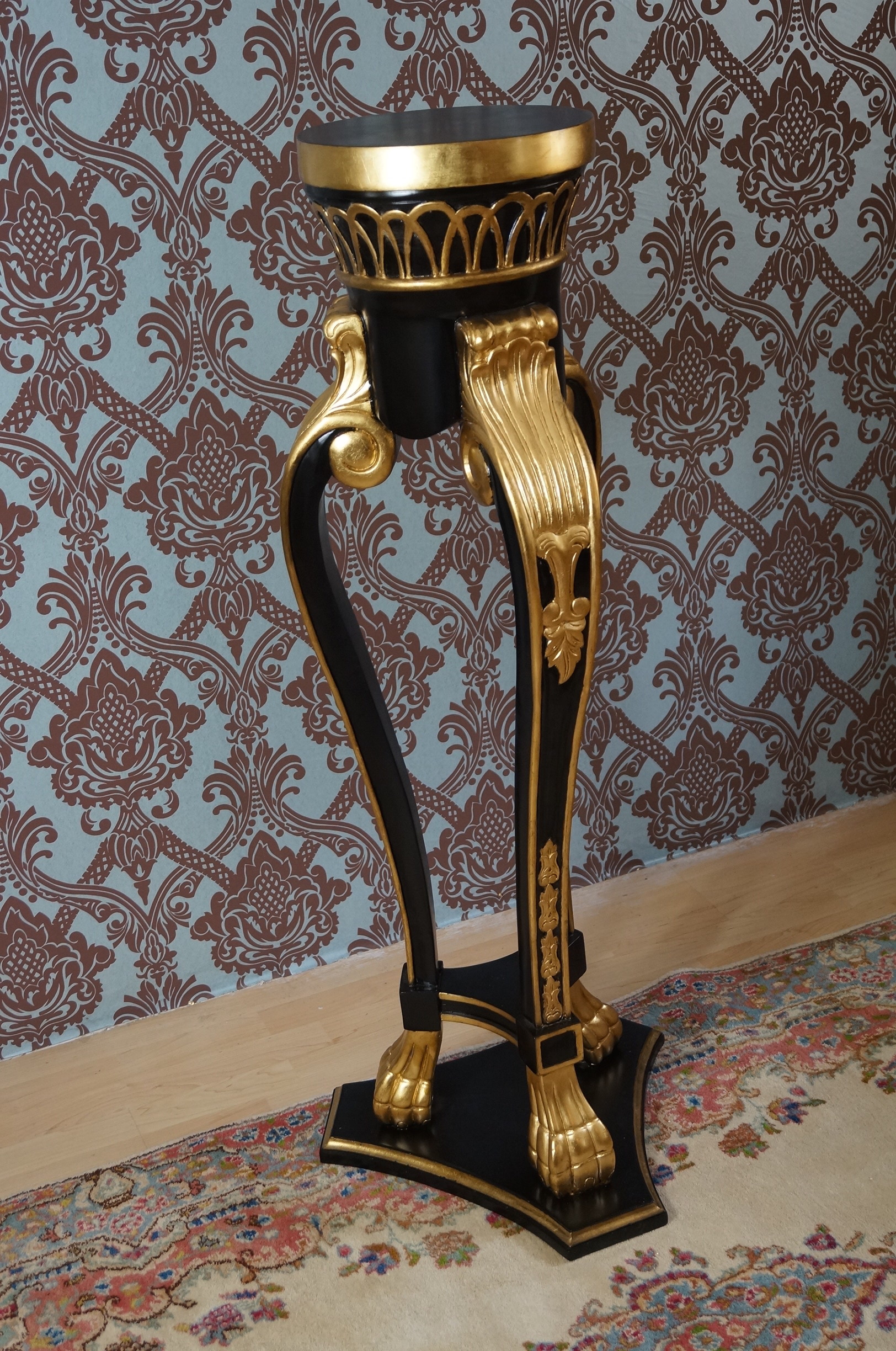 Serie de deux imposantes sellettes, noir et doré à la feuille d'or, en bois massif d'acajou, hauteur 120 cm, en dessus le plateau avec le diamètre de 30 cm, un meuble pour la décoration avec l'apparition adorable.